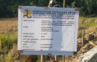 KOLAKA TIMUR, Kongkritsultra.com- Pelaksanaan proyek peningkatan dan rehabilitasi jaringan tersier daerah irigasi Tahap III di Kabupaten Kolaka Timur, Sulawesi Tenggara, menuai sorotan dari masyarakat sipil. Proyek yang dibiayai Anggaran Pendapatan dan Belanja Negara (APBN) tersebut dinilai tidak memenuhi prinsip transparansi karena papan informasi proyek tidak mencantumkan nilai kontrak pekerjaan.